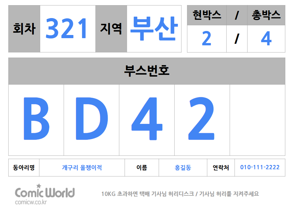 * 택배기사님들의 질환 예방 차원에서 특대형을 없애고 소형, 대형만 진행합니다. * 본 게시물에 첨부된 [코믹월드 택배지] 를 인쇄하여 정보 작성 후 택배 박스 상단에 [택배 운송장] 과 함께 반드시 붙여주세요. |