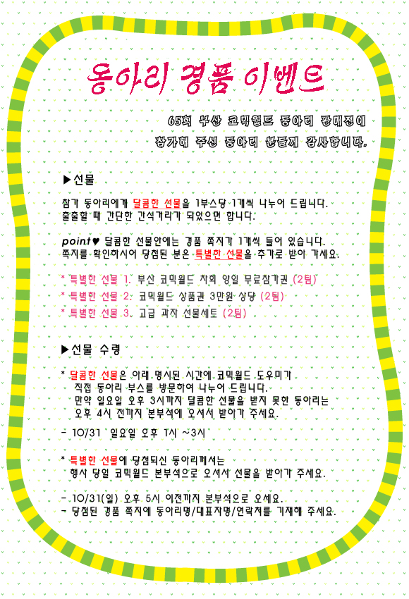 목록 65회 부산 코믹월드 - 참가 동아리 경품 이벤트(10월) 페이지 정보 작성자 코믹월드 댓글 0건 조회 2,612회 작성일 10.10.11 본문 65회 부산 코믹월드 - 참가 동아리 경품 이벤트(10월) 행사정보 코믹월드 문구전