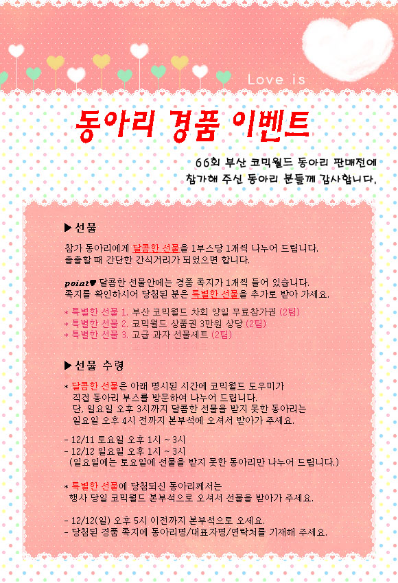 목록 66회 부산 코믹월드 - 참가 동아리 경품 이벤트(12월) 페이지 정보 작성자 코믹월드 댓글 0건 조회 2,770회 작성일 10.11.29 본문 66회 부산 코믹월드 - 참가 동아리 경품 이벤트(10월) 행사정보 코믹월드 문구전