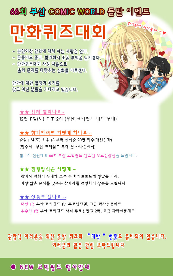 목록 66회 부산 코믹월드 - 만화퀴즈대회(12/11 토 2시) 페이지 정보 작성자 코믹월드 댓글 0건 조회 2,543회 작성일 10.12.03 본문 66회 부산 코믹월드 - 만화퀴즈대회(12/11 토 2시) 행사정보 코믹월드 문구전