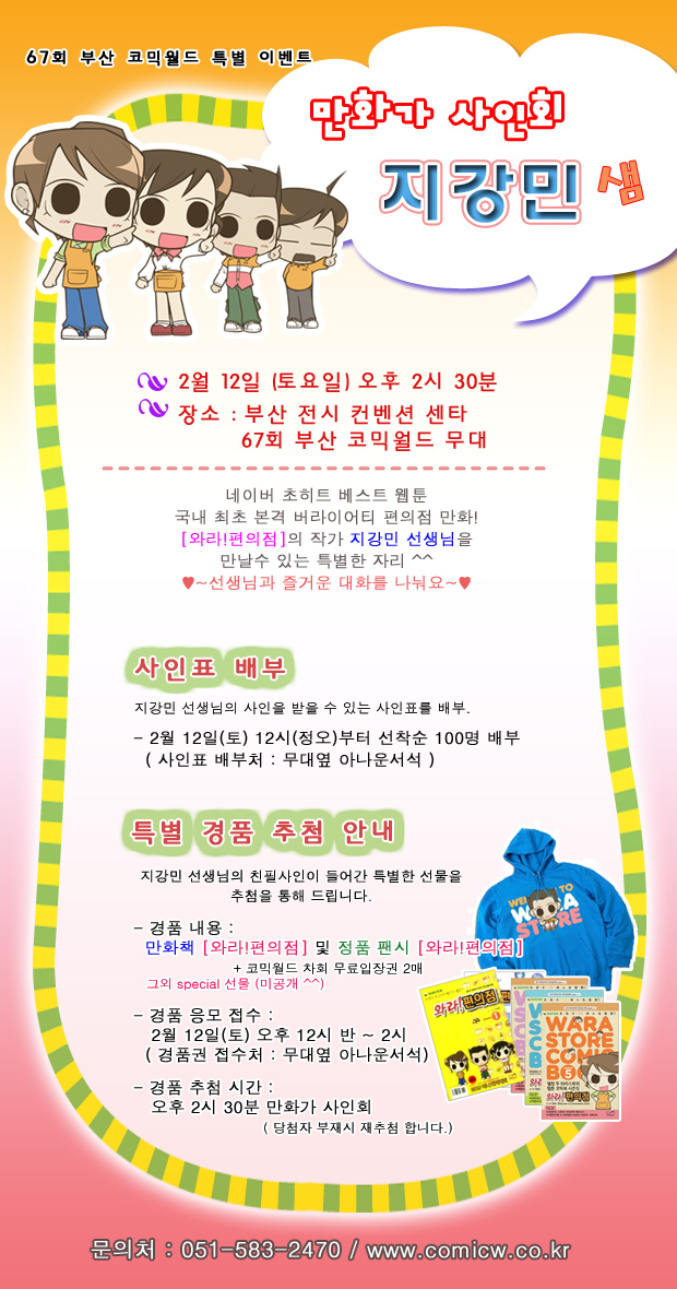 목록 67회 부산 코믹월드 만화가 사인회 (지강민 선생님 상세공지) 페이지 정보 작성자 코믹월드 댓글 0건 조회 2,055회 작성일 11.01.17 본문 * 여러분의 많은 관심과 참여 부탁드립니다. * 코믹월드님에 의해서 게시물 복사되었습니다 (2011-01-17 16:25) 행사정보 코믹월드 문구전