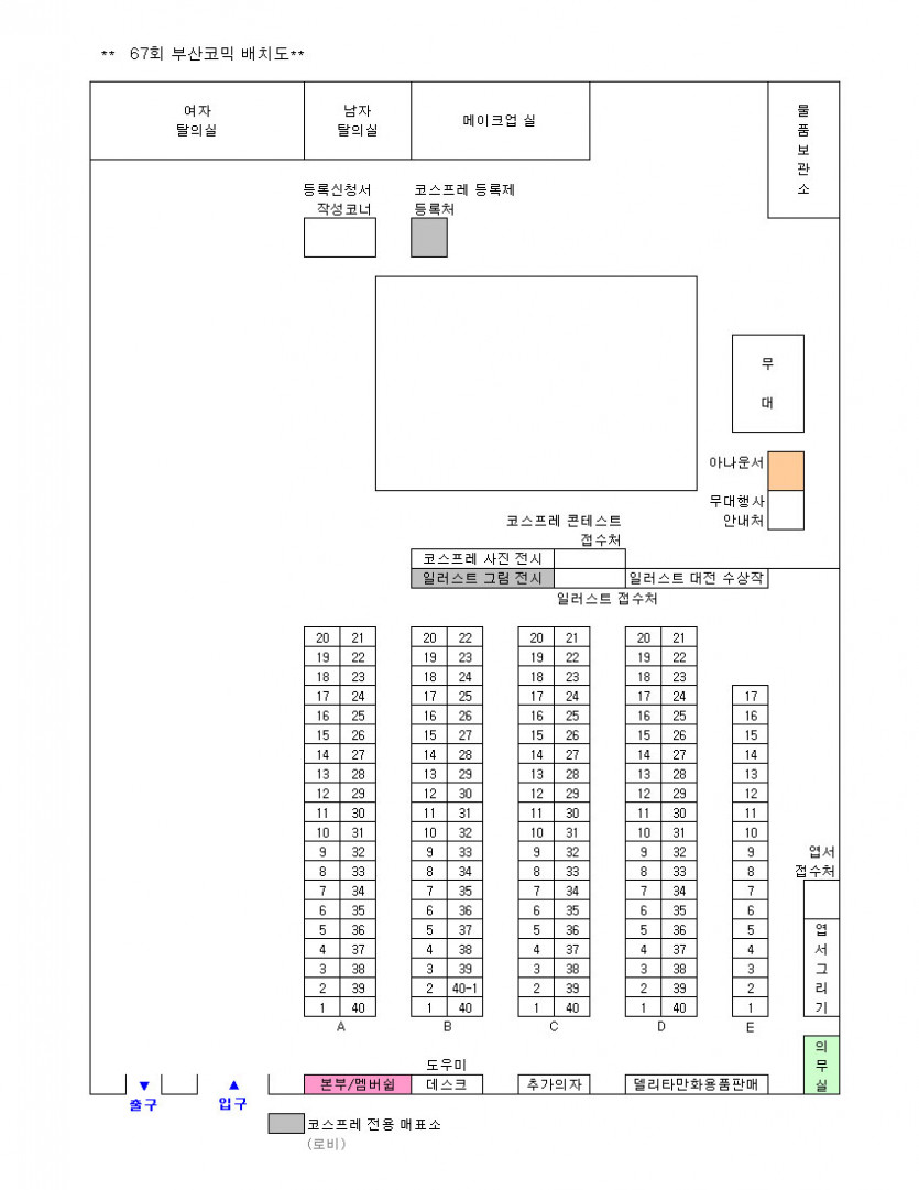 목록 <b>67회 부산 코믹월드 전시장 배치도(2월)</b> 페이지 정보 작성자 코믹월드 댓글 0건 조회 2,167회 작성일 11.01.31 본문 ※ 67회 부산 코믹월드 전시장 배치도 아래 그림을 클릭하면 좀 더 정확하게 전시장 배치도를 볼 수 있습니다. 행사정보 코믹월드 문구전
