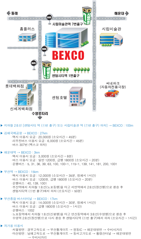 혹은 http://www.bexco.co.kr 의 교통편을 참조해 주시기 바랍니다.
