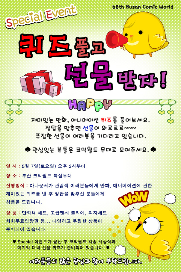 목록 68회 부산 코믹월드 special 이벤트 페이지 정보 작성자 코믹월드 댓글 0건 조회 2,374회 작성일 11.05.02 본문 68회 부산 코믹월드 special 이벤트 행사정보 코믹월드 문구전