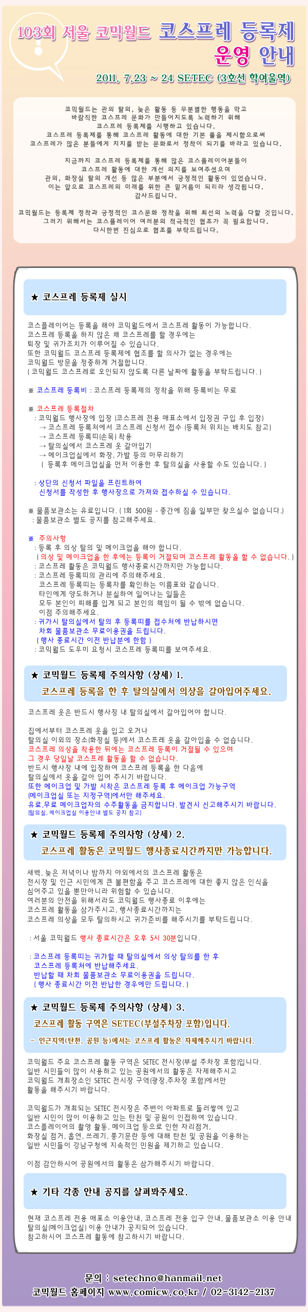 * 코스프레 활동시 기본 에티켓을 잘 지켜주시기 부탁드립니다.