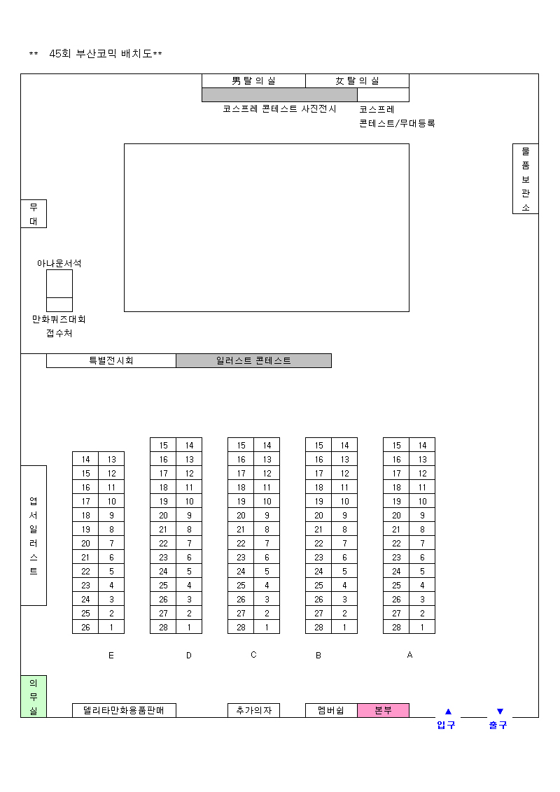 목록 45회 부산 코믹월드 전시장 배치도(12월) 페이지 정보 작성자 코믹월드 댓글 0건 조회 3,275회 작성일 07.11.26 본문 ※ 45회 부산 코믹월드 전시장 배치도 아래 그림을 클릭하면 좀 더 정확하게 전시장 배치도를 볼 수 있습니다. 행사정보 코믹월드 문구전
