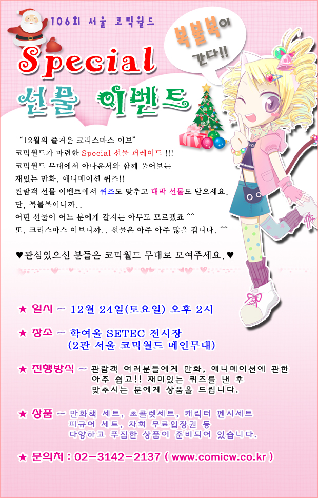 목록 106회 서울 코믹월드-special 선물이벤트 [복불복이 간다] 페이지 정보 작성자 코믹월드 댓글 0건 조회 2,364회 작성일 11.12.15 본문 많은 관심 부탁드립니다. * 코믹월드님에 의해서 게시물 복사되었습니다 (2011-12-15 17:29) 행사정보 코믹월드 문구전