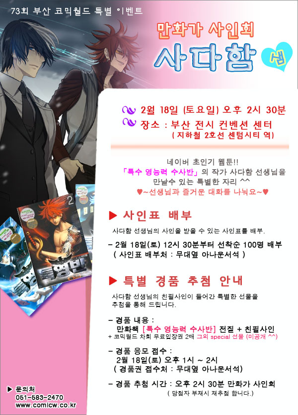 목록 73회 부산 코믹월드 만화가 사인회 (사다함 선생님 상세공지) 페이지 정보 작성자 코믹월드 댓글 0건 조회 2,522회 작성일 12.02.02 본문 * 여러분의 많은 관심과 참여 부탁드립니다. 행사정보 코믹월드 문구전