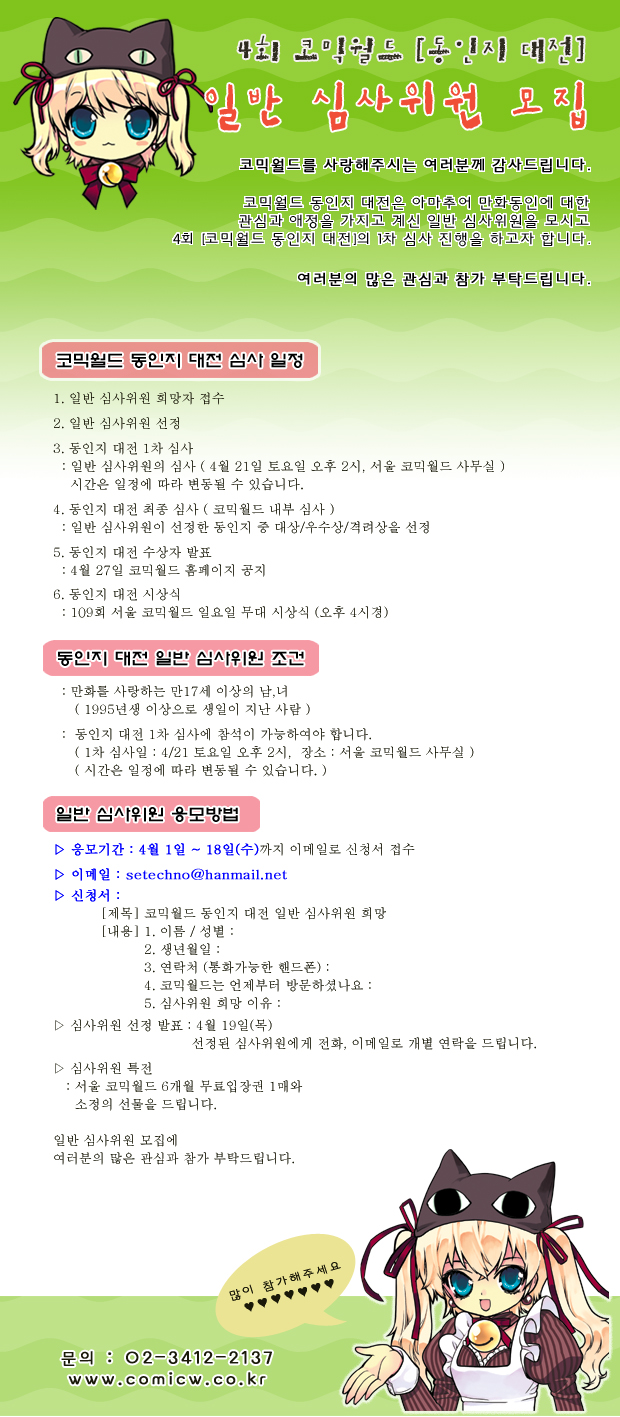 목록 4회 [코믹월드 동인지 대전] 일반 심사위원(00명) 모집 페이지 정보 작성자 코믹월드 댓글 0건 조회 1,909회 작성일 12.04.02 본문 * 여러분의 많은 관심과 참가 부탁드립니다. 행사정보 코믹월드 문구전