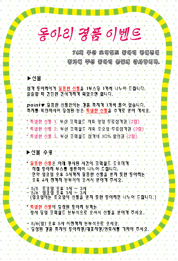 목록 74회 부산 코믹월드 - 참가 동아리 경품 이벤트(5월) 페이지 정보 작성자 코믹월드 댓글 0건 조회 1,990회 작성일 12.04.09 본문 * 참가해 주신 동아리 분들께 감사합니다. 행사정보 코믹월드 문구전