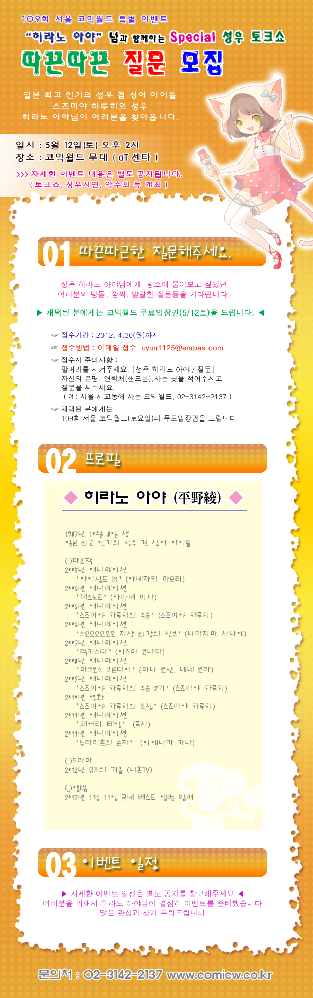 목록 109회 서울 코믹월드- 성우토크쇼 히라노 아야 [질문모집] 페이지 정보 작성자 코믹월드 댓글 0건 조회 2,473회 작성일 12.04.13 본문 * 여러분의 많은 관심과 참여 부탁드립니다. 행사정보 코믹월드 문구전