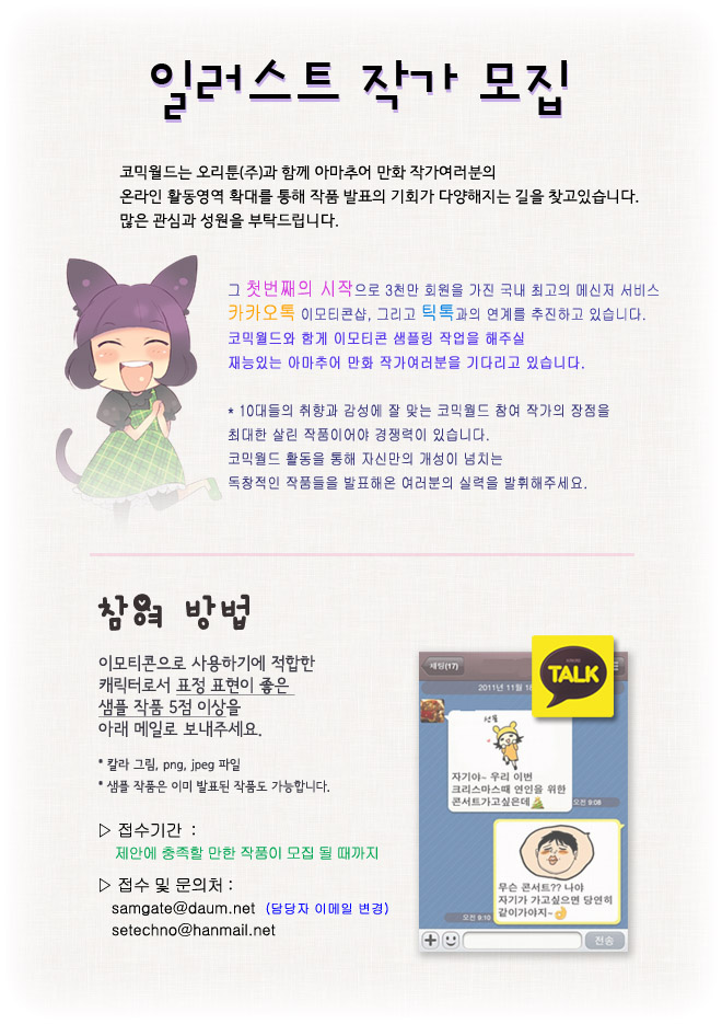 목록 [코믹월드 Event] 이모티콘 일러스트 작가 모집 페이지 정보 작성자 코믹월드 댓글 0건 조회 2,579회 작성일 12.07.04 본문 * 여러분의 많은 관심과 참가 부탁드립니다. 행사정보 코믹월드 문구전