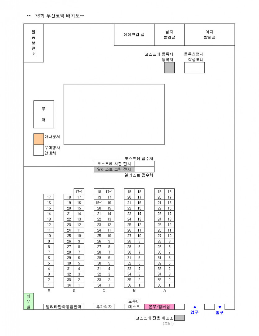 목록 76회 부산 코믹월드 전시장 배치도(8월) 페이지 정보 작성자 코믹월드 댓글 0건 조회 1,931회 작성일 12.08.13 본문 ※ 76회 부산 코믹월드 전시장 배치도(8월) 아래 그림을 클릭하면 좀 더 정확하게 전시장 배치도를 볼 수 있습니다. 행사정보 코믹월드 문구전