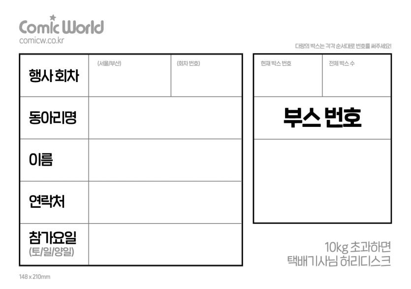 * 택배기사님들의 질환 예방 차원에서 특대형을 없애고 소형, 대형만 진행합니다. * 본 게시물에 첨부된 [코믹월드 택배지] 를 인쇄하여 정보 작성 후 택배 박스 상단에 [택배 운송장] 과 함께 반드시 붙여주세요. ※ [코믹월드 택배지] + [운송장] 미부착 택배는 행사장 운반이 불가합니다. | |||
