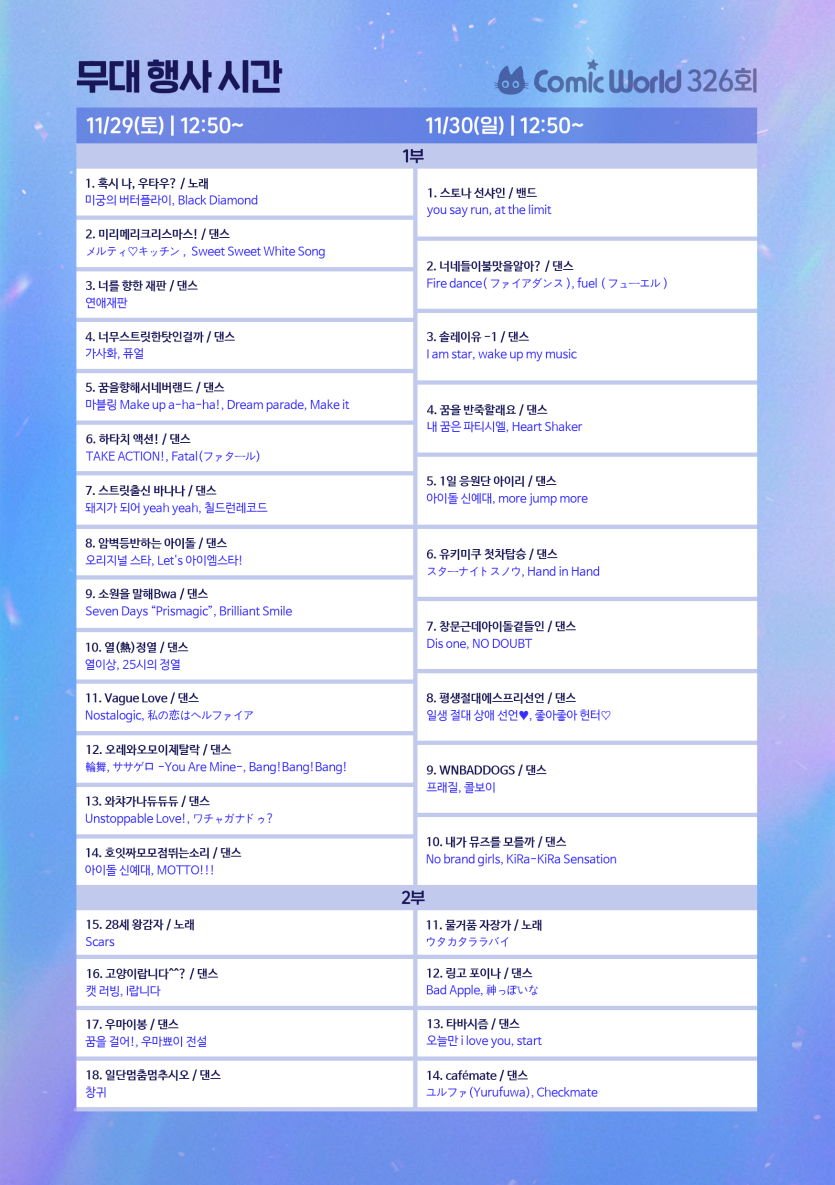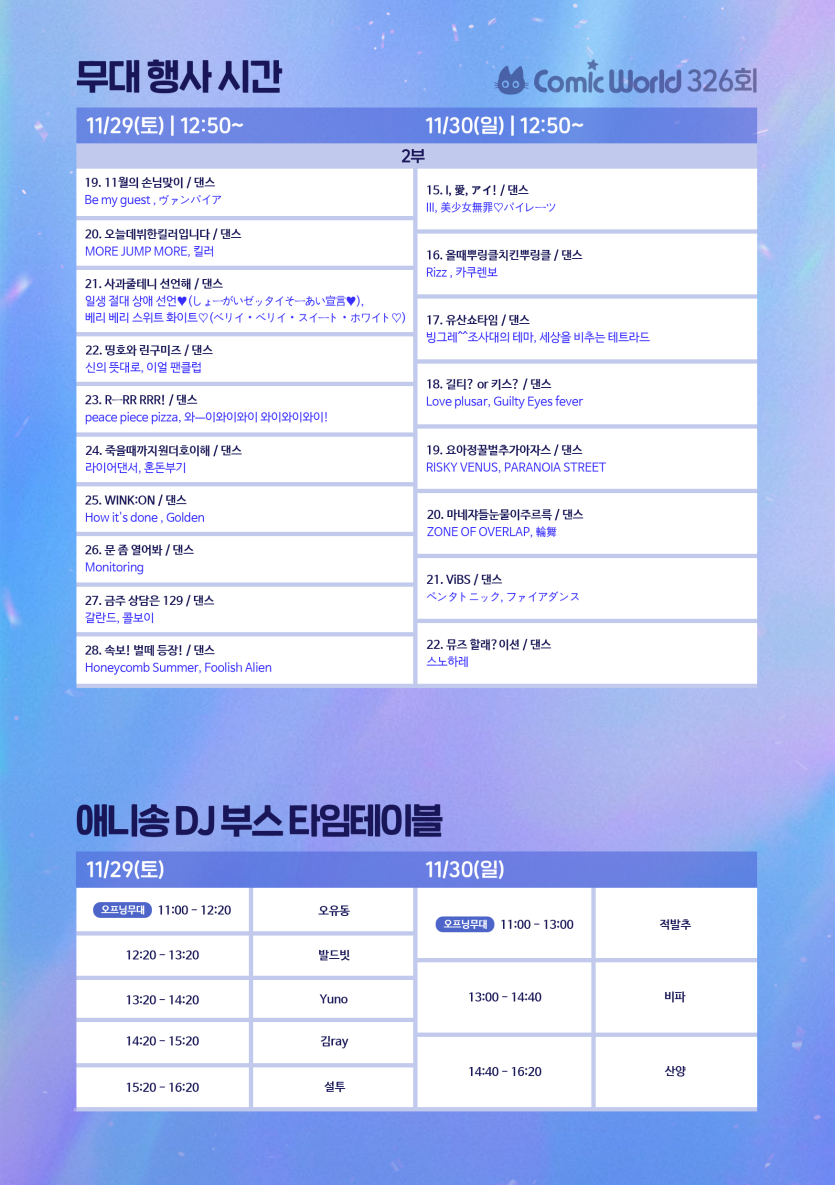 대구 코믹월드 326 대구 (11월) 코스튬플레이 무대 이벤트 참가자 리스트