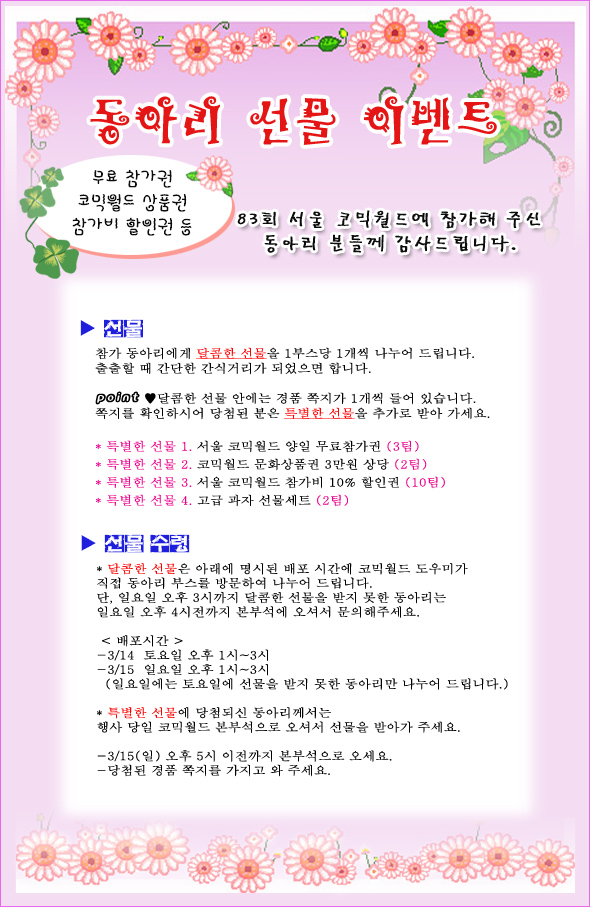 목록 83회 서울 코믹월드 동아리 선물 이벤트 페이지 정보 작성자 코믹월드 댓글 0건 조회 2,183회 작성일 09.02.19 본문 [이 게시물은 코믹월드님에 의해 2009-02-19 18:09:52 동아리 공지에서 복사 됨] 행사정보 코믹월드 문구전