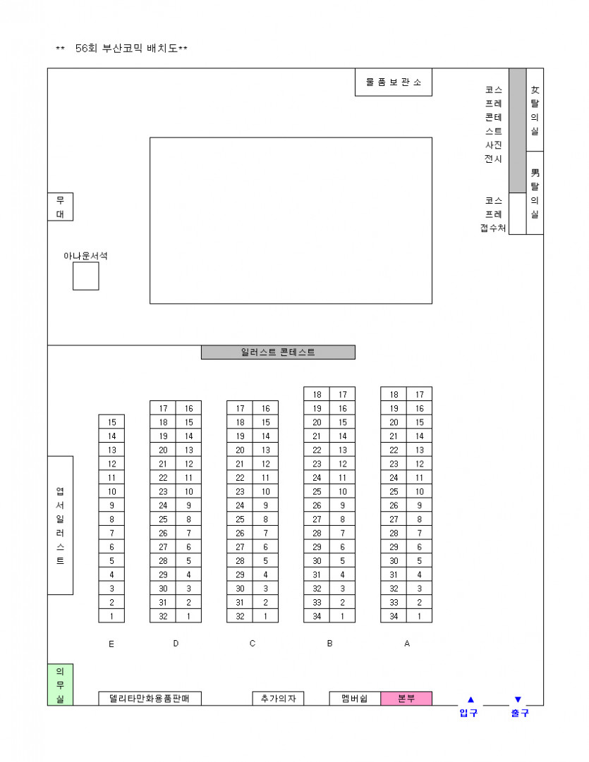 목록 56회 부산 코믹월드 전시장 배치도(7월) 페이지 정보 작성자 코믹월드 댓글 0건 조회 2,429회 작성일 09.06.22 본문 ※ 56회 부산 코믹월드 전시장 배치도 아래 그림을 클릭하면 좀 더 정확하게 전시장 배치도를 볼 수 있습니다. 행사정보 코믹월드 문구전