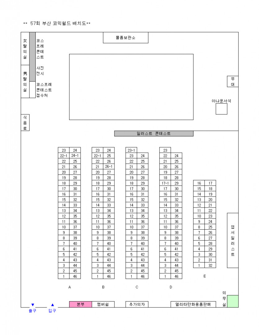 목록 57회 부산 코믹월드 전시장 배치도(8월) 페이지 정보 작성자 코믹월드 댓글 0건 조회 2,342회 작성일 09.08.10 본문 ※ 57회 부산 코믹월드 전시장 배치도 아래 그림을 클릭하면 좀 더 정확하게 전시장 배치도를 볼 수 있습니다. 행사정보 코믹월드 문구전