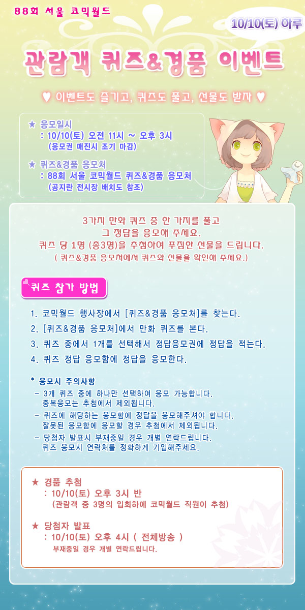 목록 88회 서울 코믹월드 퀴즈&경품 이벤트(10/10토) 페이지 정보 작성자 코믹월드 댓글 0건 조회 2,688회 작성일 09.10.01 본문 많은 관심과 참여부탁드립니다. * 코믹월드님에 의해서 게시물 복사되었습니다 (2009-10-01 16:52) 행사정보 코믹월드 문구전