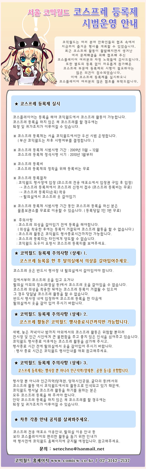 목록 서울 코믹월드 코스프레 등록제 시범운영 안내 (11월부터) 페이지 정보 작성자 코믹월드 댓글 0건 조회 3,885회 작성일 09.10.09 본문 * 89회 서울코믹월드(11월)부터 시행되는 코스프레 등록제 시범운영에 많은 협조 부탁드립니다. 88회 서울 코믹월드(10월)에서는 시행되지 않으며 코스플레어분들에게 홍보활동을 합니다. 행사정보 코믹월드 문구전