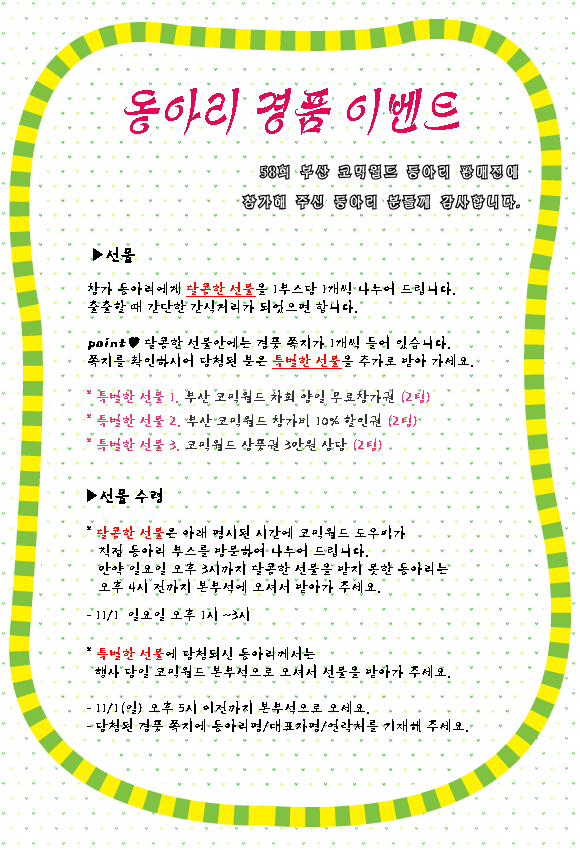 목록 58회 부산 코믹월드 동아리 경품 이벤트(11월) 페이지 정보 작성자 코믹월드 댓글 0건 조회 2,390회 작성일 09.10.14 본문 58회 부산 코믹월드 동아리 경품 이벤트(11월) 행사정보 코믹월드 문구전