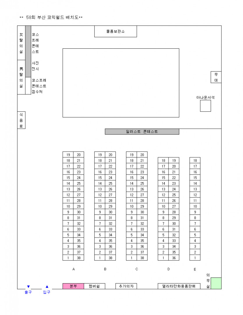 목록 58회 부산 코믹월드 전시장 배치도(11월) 페이지 정보 작성자 코믹월드 댓글 0건 조회 2,959회 작성일 09.10.19 본문 ※ 58회 부산 코믹월드 전시장 배치도 아래 그림을 클릭하면 좀 더 정확하게 전시장 배치도를 볼 수 있습니다. 행사정보 코믹월드 문구전