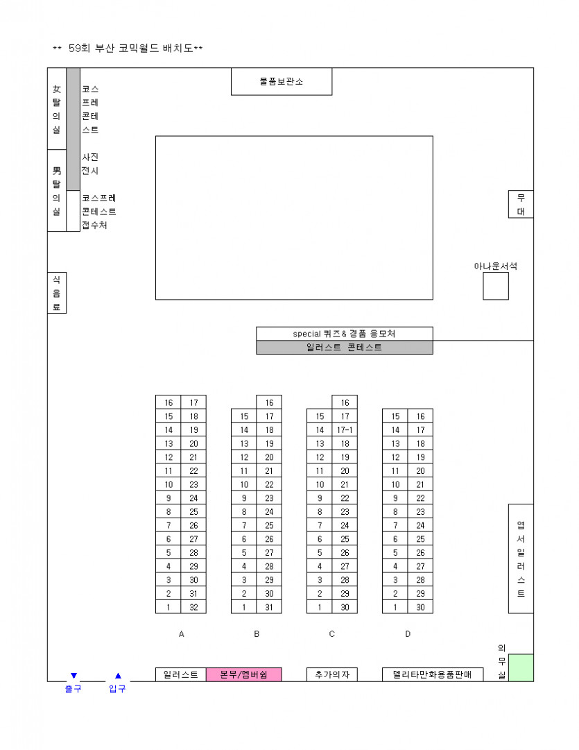 목록 59회 부산 코믹월드 전시장 배치도(12월) 페이지 정보 작성자 코믹월드 댓글 0건 조회 2,694회 작성일 09.11.30 본문 ※ 59회 부산 코믹월드 전시장 배치도 아래 그림을 클릭하면 좀 더 정확하게 전시장 배치도를 볼 수 있습니다. 행사정보 코믹월드 문구전