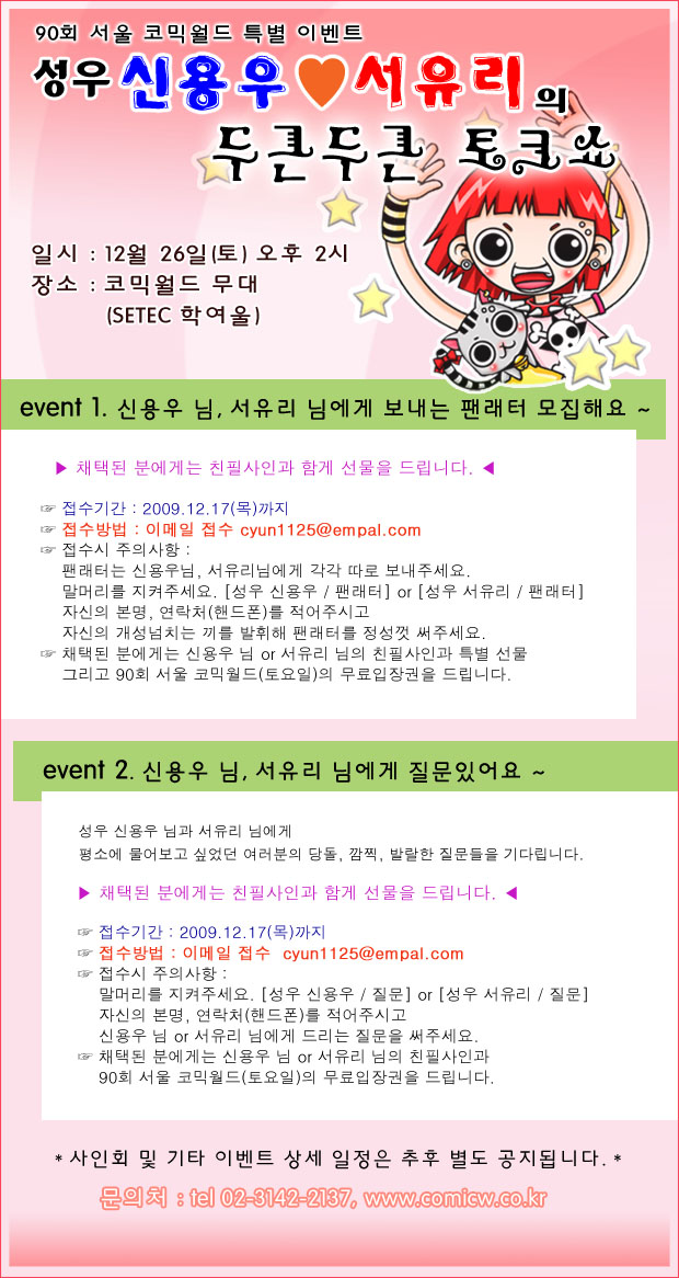 목록 성우 신용우, 서유리의 두근두근 토크쇼 (팬레터, 질문 응모) 페이지 정보 작성자 코믹월드 댓글 0건 조회 3,725회 작성일 09.12.04 본문 여러분의 많은 관심과 응모 부탁드립니다. * 코믹월드님에 의해서 게시물 복사되었습니다 (2009-12-04 17:27) 행사정보 코믹월드 문구전