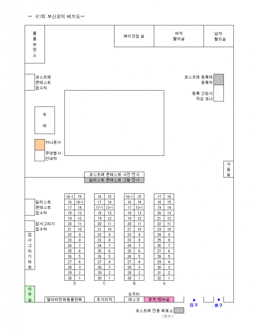 목록 61회 부산 코믹월드 전시장 배치도(3월) 페이지 정보 작성자 코믹월드 댓글 0건 조회 2,621회 작성일 10.03.02 본문 ※ 61회 부산 코믹월드 전시장 배치도 아래 그림을 클릭하면 좀 더 정확하게 전시장 배치도를 볼 수 있습니다. 행사정보 코믹월드 문구전