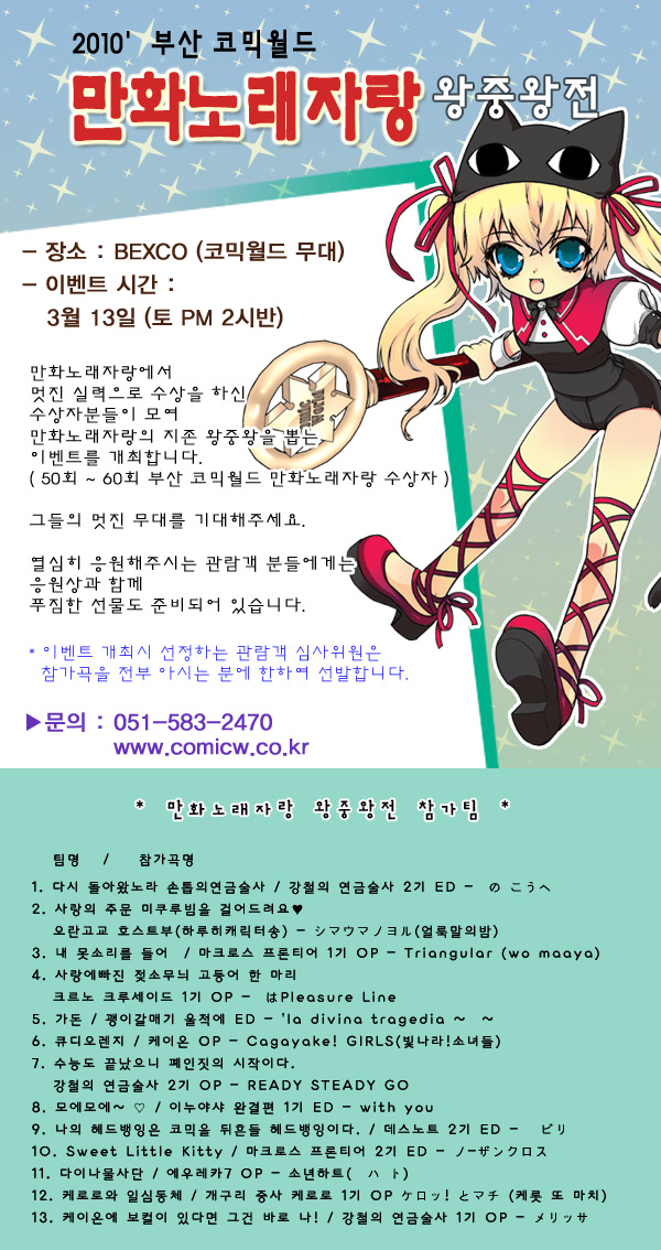 목록 61회 부산 코믹월드 만화노래자랑 왕중왕전(3/13 토 2시반) 페이지 정보 작성자 코믹월드 댓글 0건 조회 2,914회 작성일 10.03.05 본문 * 많은 성원과 관심 부탁드려요. * 코믹월드님에 의해서 게시물 복사되었습니다 (2010-03-05 16:30) 행사정보 코믹월드 문구전