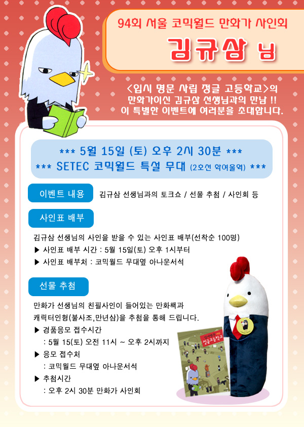 목록 94회 서울 코믹월드 만화가 사인회 (김규삼 님) 페이지 정보 작성자 코믹월드 댓글 0건 조회 2,501회 작성일 10.04.29 본문 여러분의 많은 관심과 참가 부탁드립니다. 행사정보 코믹월드 문구전